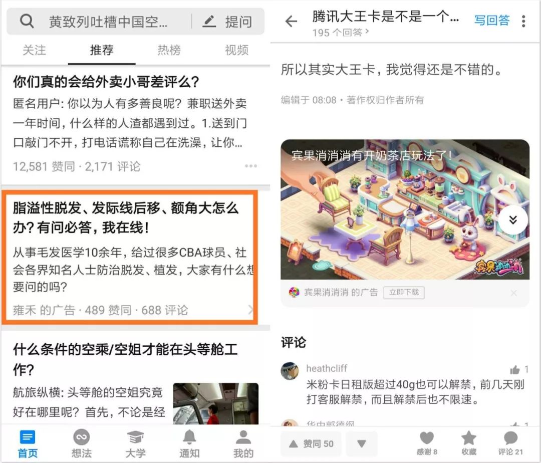 知乎,无论关注还是推荐页,一律2~3屏一个广告。甚至,评论区也有广告。广告质量良莠不齐,除了理财、游戏等,还有减肥、植发广告。莆田系广告一事,彻底点燃了用户的怒火,“高级百度”的论调又多了起来。