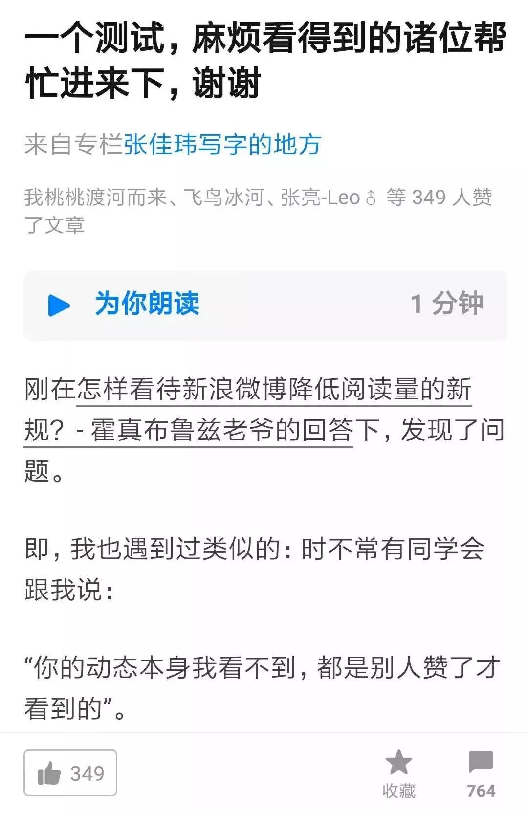 因为专业内容流量减少,知乎限流一直是个热门话题。前段时间,知乎头牌@张佳玮 就曾公开截图测试:时间线上看不到这条动态的吱一声。