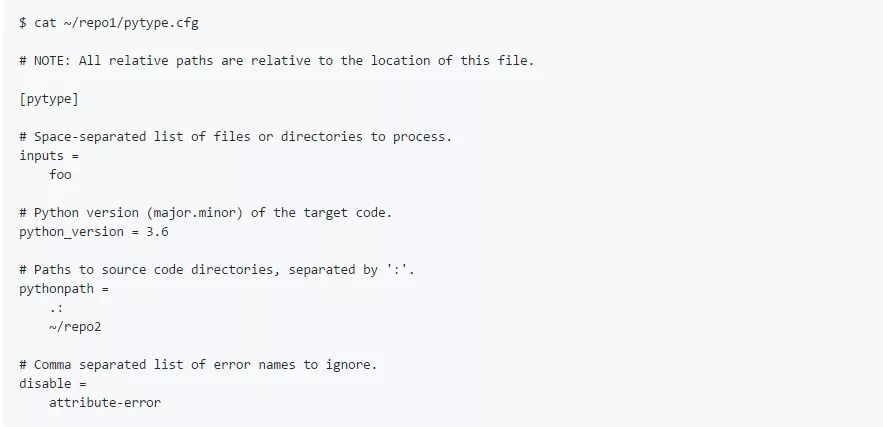 下面是设置好的配置文件,它将指示pytype将~/repo1/foo作为Python 3.6代码进行类型检查,在~/repo1和~/repo2中查找包,并忽略属性错误。注意,到包的路径不包括包本身。
