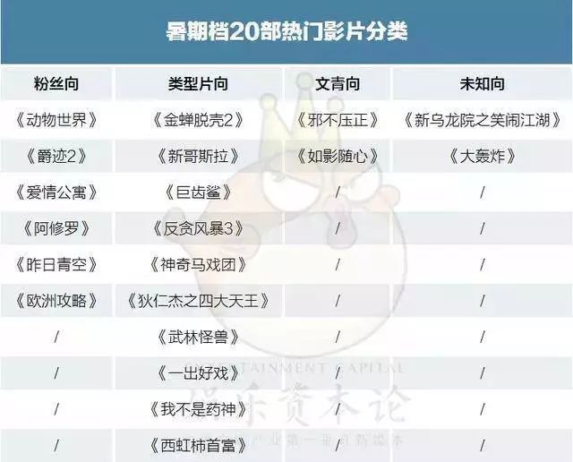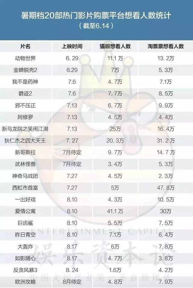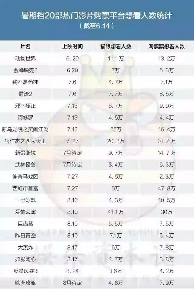 目前市面上反映电影热度的指数有很多,其中对于影院经理排片来说,一个比较重要的指标是购票平台上的想看指数。小娱根据购票平台上的想看数据,选取了20部暑期档热门影片做了个表格。