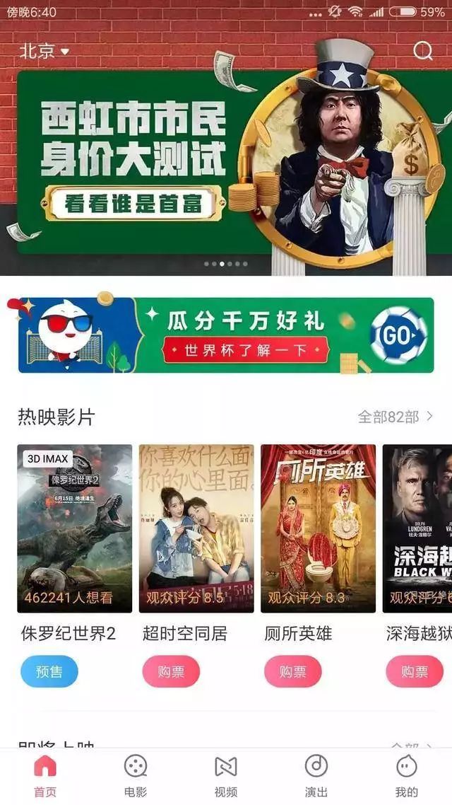 淘票票主推的暑期档影片则是《西虹市首富》,或许是因为阿里影业是这部电影的出品方和发行方之一。打开淘票票购票软件,能看到《西虹市首富》的banner在首页轮番滚动。这部电影在淘票票上的想看人数高达47万。而在猫眼电影上想看人数却只有4.9万,相差近10倍。