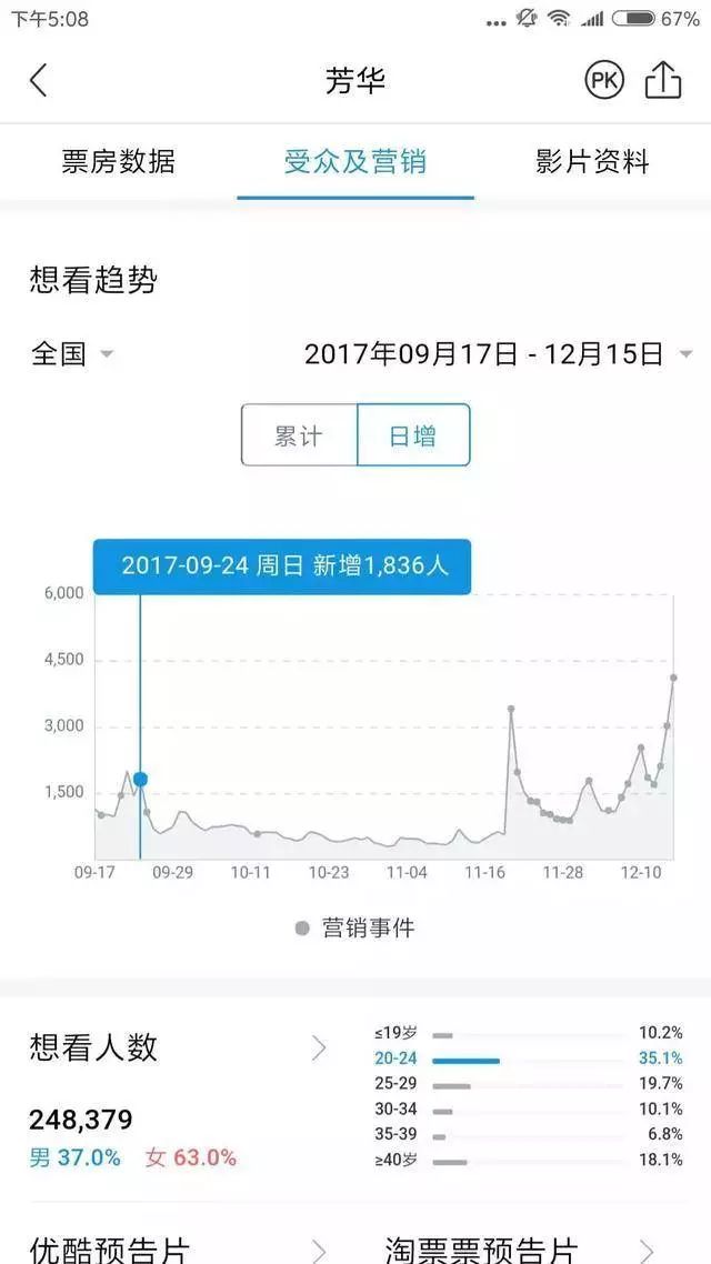 事实上,有时候想看人数增长并不是因为营销效果好,而是因为特殊事件。比如《芳华》在9月23日传出撤出国庆档的消息后,想看人数有了小幅度的增长。