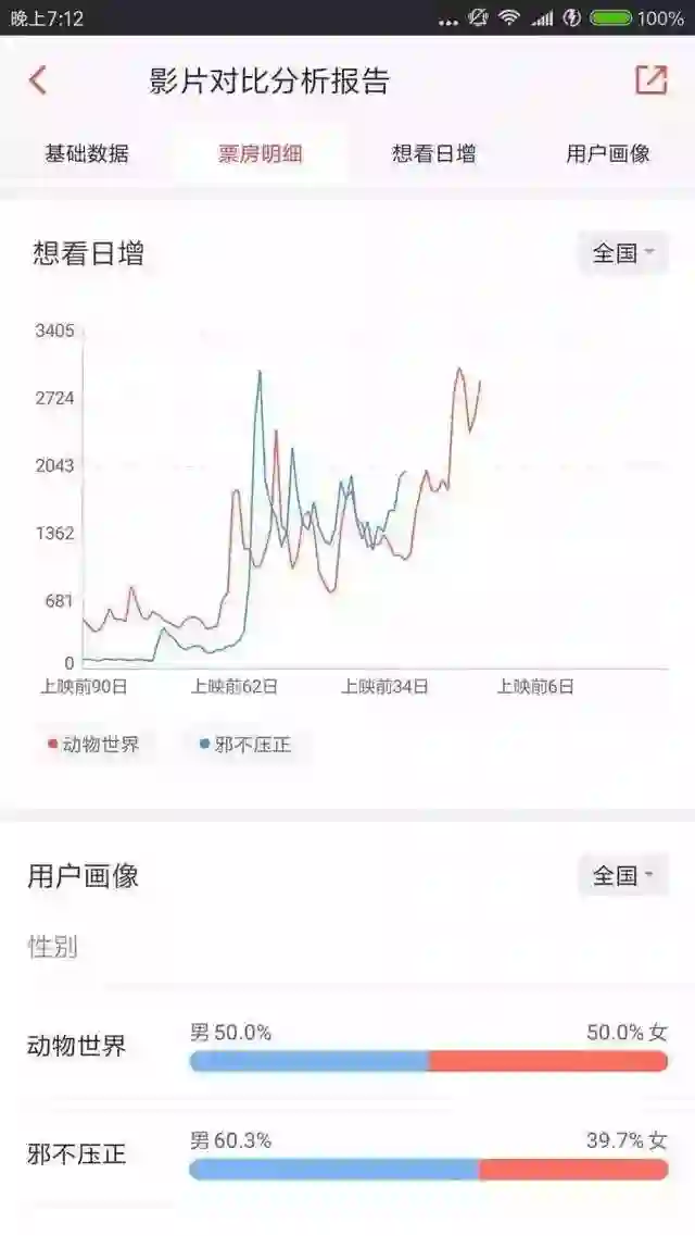 为了排除偶然性,小娱又选取了两部暑期档影片在猫眼上的数据作对比。一部是李易峰主演的《动物世界》,一部是姜文导演的《邪不压正》。目前《动物世界》在猫眼和淘票票两个购票平台上的想看人数都比《邪不压正》多。能看到《动物世界》在上映前90天的想看日增一直是高于《邪不压正》的。直到上映前60日左右时才被《邪不压正》反超(原因是5月15日《邪不压正》发布了定档预告)。