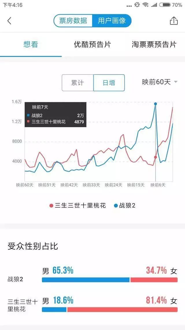 粉丝的力量有这么强大吗?因为想看按钮在电影上映后依然能点,所以现在比较《战狼2》和《三生三世十里桃花》两部电影的想看人数已经没太大意义,我们直接比较两部电影在淘票票专业版上的想看日增折线图。