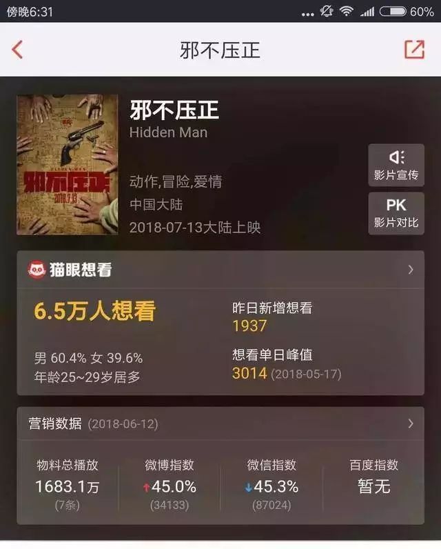 所以在猫眼专业版上,《邪不压正》的物料播放量很高,但由于电影类型的原因,想看人数并不多。