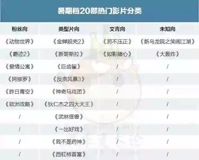 而像《新哥斯拉》《巨齿鲨》这样的科幻片和《金蝉脱壳2》《反贪风暴》这样的悬疑片,以及《神奇马戏团》这种面向儿童的动画片,因为本身受众比较垂直,所以定位明确,点击想看的人大多就是奔着这种类型而来,票房转化率可能会更高一些。
