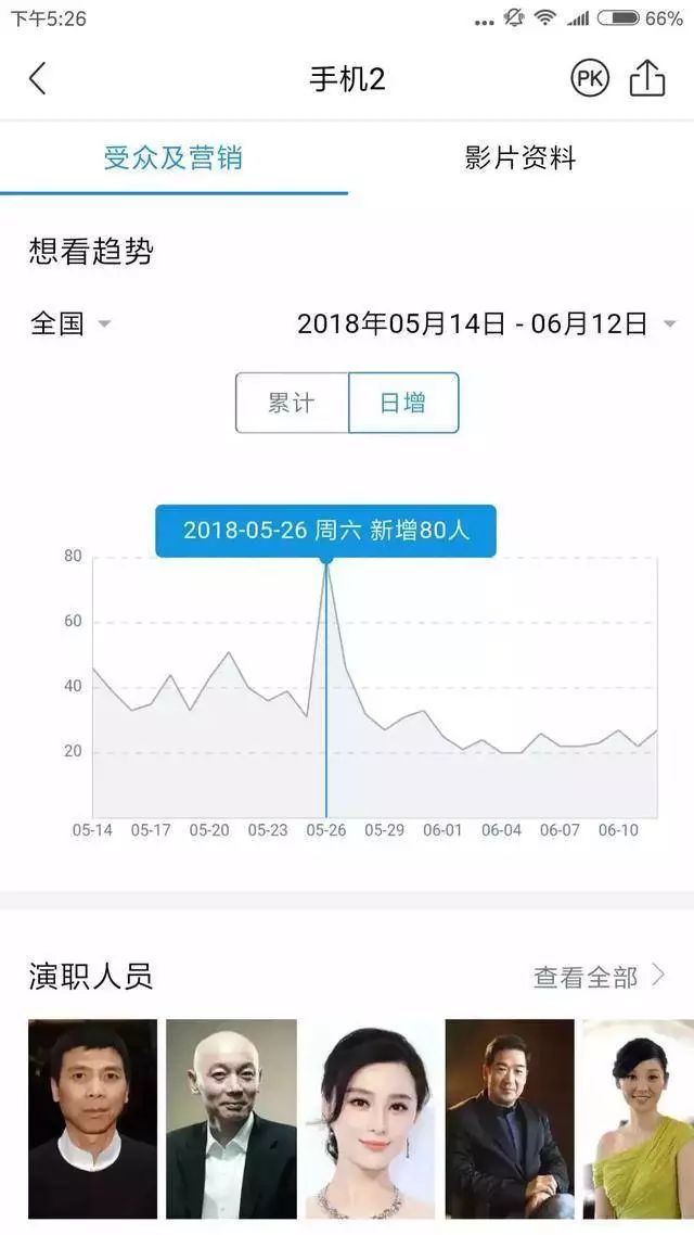当然这种特殊事件不一定都能让人产生观影意愿,因此也就不会引起想看人数的增长。比如最近崔永元手撕《手机2》剧组,新闻非常多,《手机2》的百度指数、微博指数和微信指数都很高,但想看人数增长并不快。从淘票票专业版上的数据来看,除了5月26日崔永元微博炮轰冯小刚夫妇时有一个较高的增长,后续崔永元放更多料时想看人数日增反而是下降的。