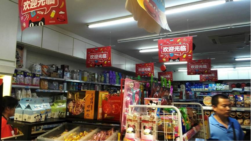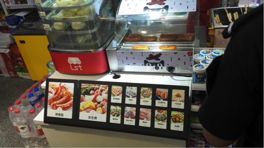 黄店主表示,天猫的改造主要是四部分,门口店招,新天猫零食货架,包子、关东煮等鲜食,还有POS机,据说以后还有其他服务。现在最招人的就是门口的这个天猫电子屏,老黄店主推荐老赵以后也选电子屏店招。