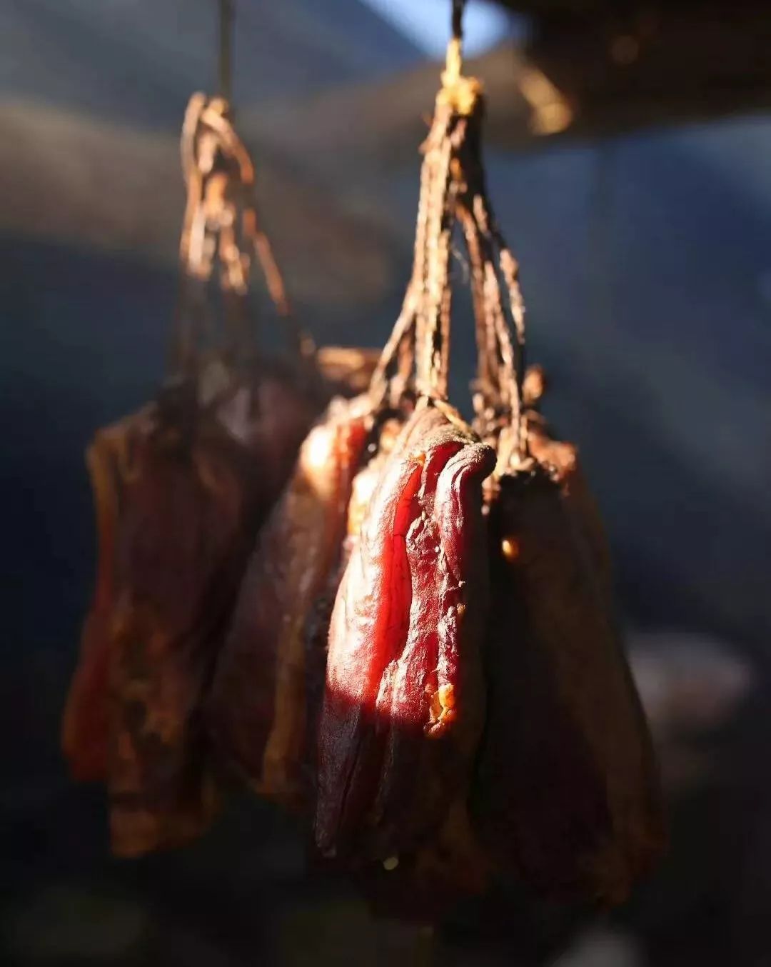 将洗净、修整好边角的猪肉用岩盐、花椒等调料均匀涂抹,置于陶缸中腌制两天,之后便是入炕熏制。为了最大程度地把木果香熏入肉中,我们特地选用柏树枝、柑橘皮以及核桃壳等混合熏制。满熏三日后,挂于檐下,靠山中清风自然风干,带走多余的柴禾气。