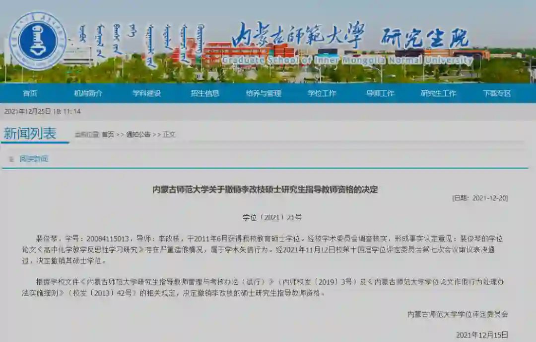 根据学校文件《内蒙古师范大学研究生指导教师管理与考核办法(试行)》(内师校发〔2019〕3号)及《内蒙古师范大学学位论文作假行为处理办法实施细则》(校发〔2013〕42号)的相关规定,决定撤销李改枝的硕士研究生指导教师资格。