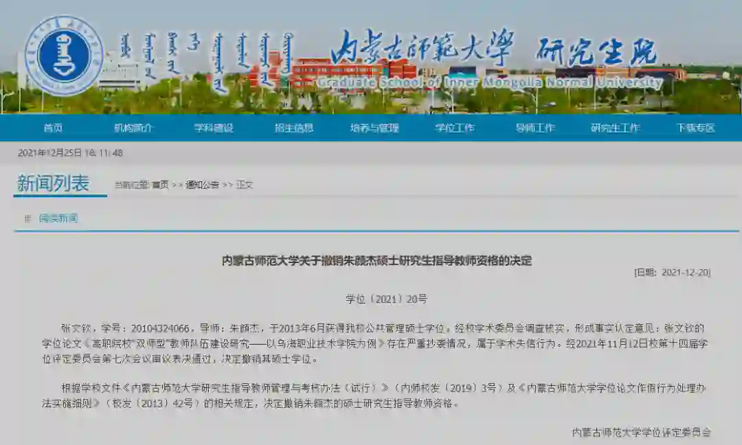 内蒙古师范大学关于撤销朱颜杰硕士研究生指导教师资格的决定