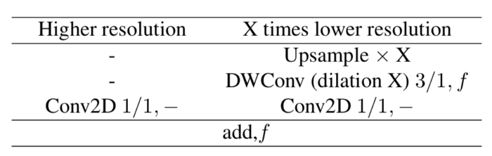 第二个输入是全局特征提取器的输出。但在加入第二个输入之前,它们首先进行上采样(4,4),然后进行DepthWise卷积,最后是另一个point-wise卷积。在point-wise卷积输出中不添加激活,激活是在这两个输入相加后引入的。