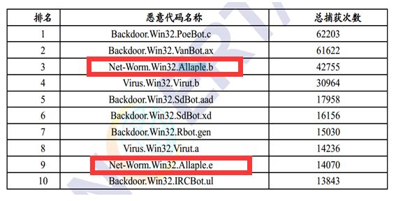 2007年1月1日至6月30日期间,蜜网捕获次数前十名的恶意代码样本