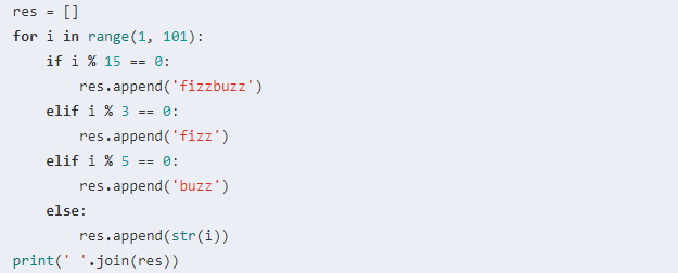 这个例子灵感来自 Joel Grus 的一次 应聘面试. 面试官让他写个程序来玩 Fizz Buzz. 这是一个小孩子游戏。玩家从 1 数到 100,如果数字被 3 整除,那么喊’fizz’,如果被 5 整除就喊’buzz’,如果两个都满足就喊’fizzbuzz’,不然就直接说数字。这个游戏玩起来就像是: