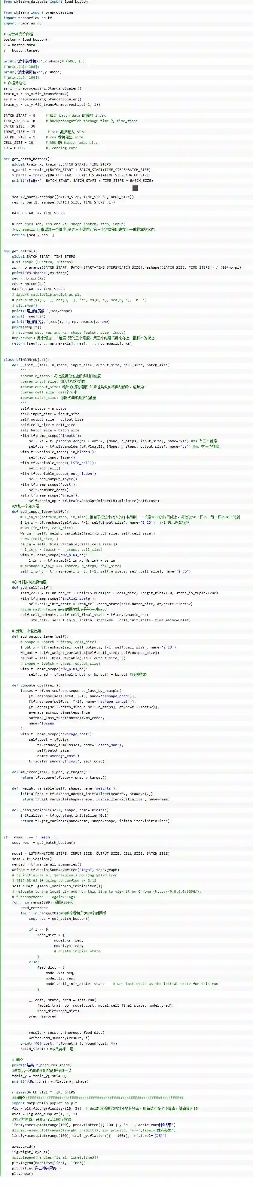 在tensorflow里RNN才是做回归计算的正规军,其中LSTM更是让人工智能有了记忆,如果cnn最适合做的是图像识别,那么LSTM就是视频识别。网上的教程多是用正余弦数据在做预测,输入输出都是一维,我这用波士顿房价,输入是13个特征!
