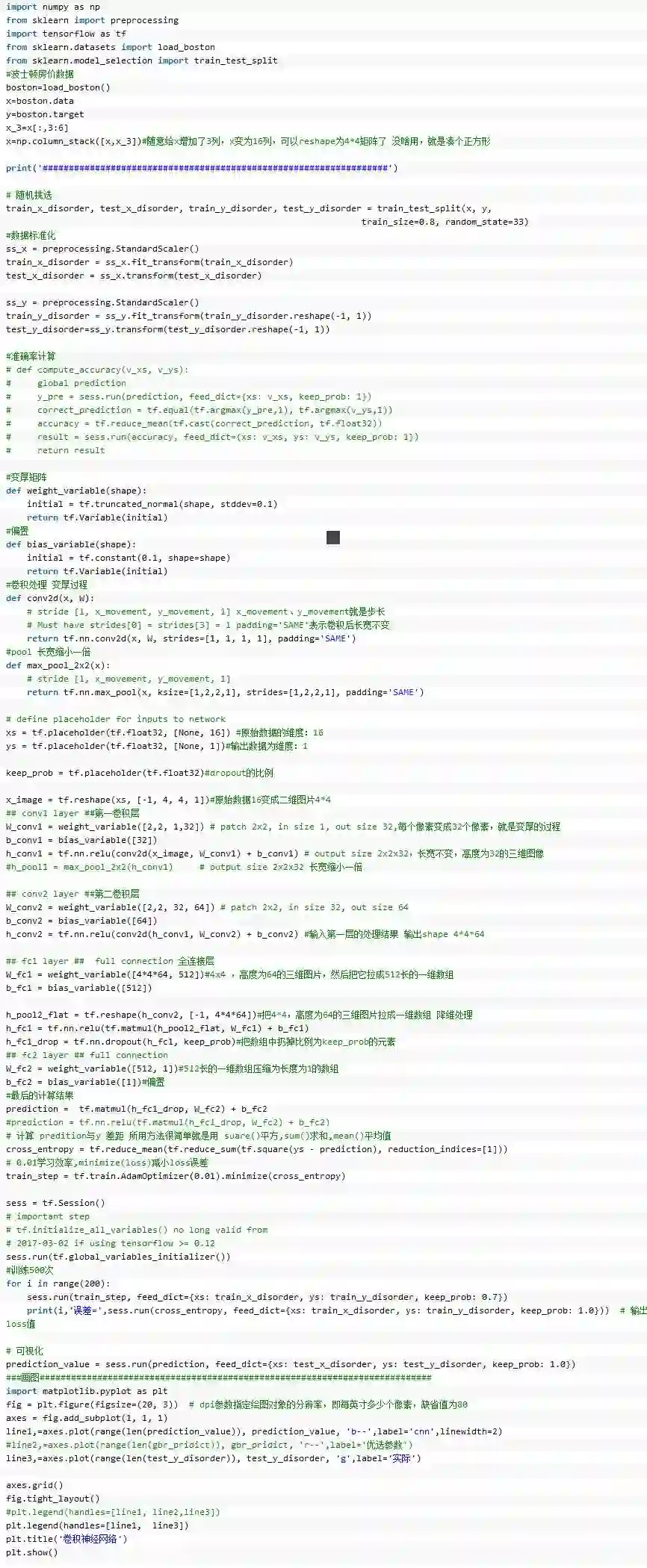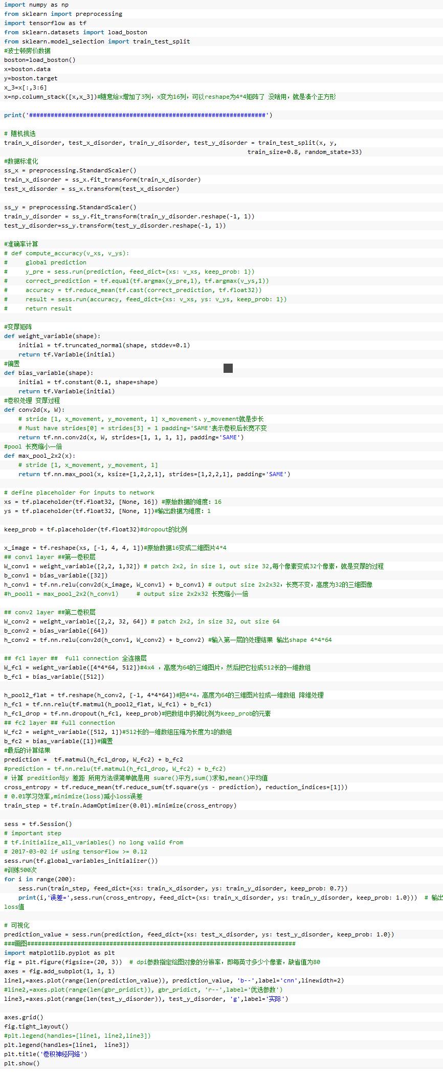 另外cnn虽然不用人工特征优选,但是搭建它的拓扑结构实在是个难搞的事,最让人炸裂的是tensorflow的结构,真是让人费解,关于它的结构网上很多介绍,我就不说了,但是用cnn做回归计算的文章非常罕见,请点赞!上代码