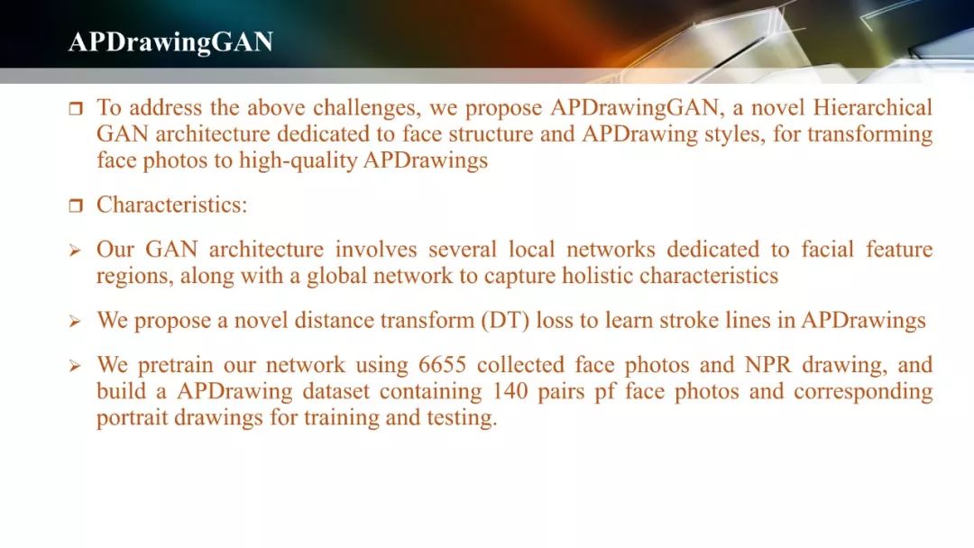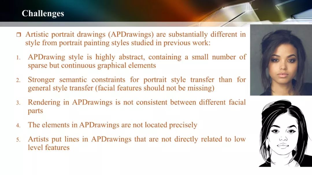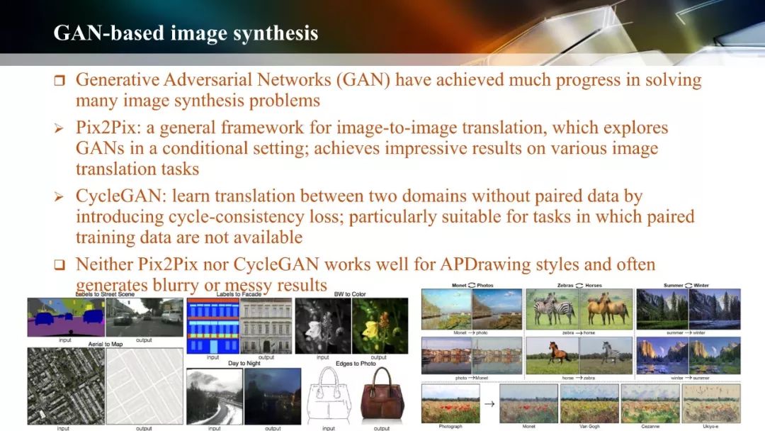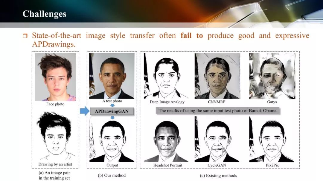 在这次报告中,我会展示如何使用针对人脸设计的生成对抗网络,学习不同面部特征的专用绘制策略,从单张人脸照片生成高质量的艺术肖像画。该研究成果录取为CVPR 2019的oral论文。
