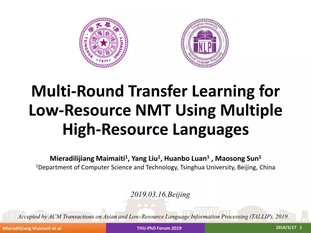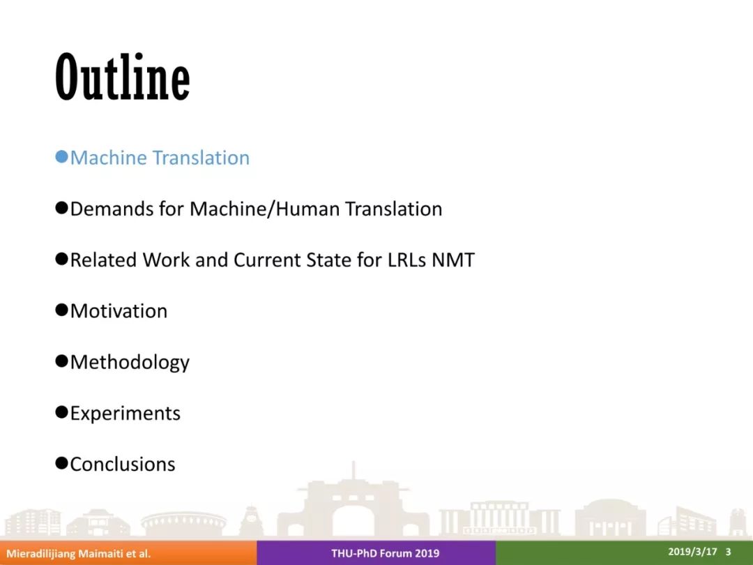 在这次报告中,首先讲一下神经网络机器翻译研究的目前总况,同时介绍一下低资源语言翻译中的有些挑战;其次,介绍一下低资源机器翻译研究中的已有的工作(好处并短处);再次,将详细介绍我们本篇论文中提出的方案、跟前人工作的比较以及所取得的成绩;最后跟大家分享一下本领域的发展趋势并尚未得到解决的问题。