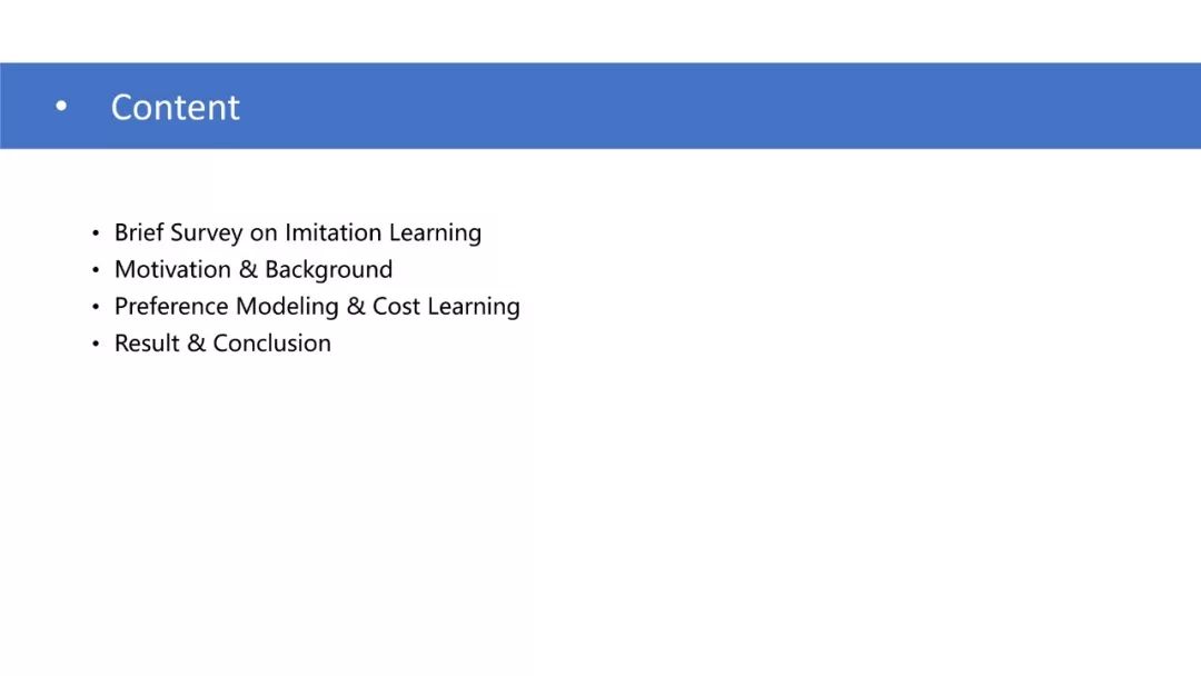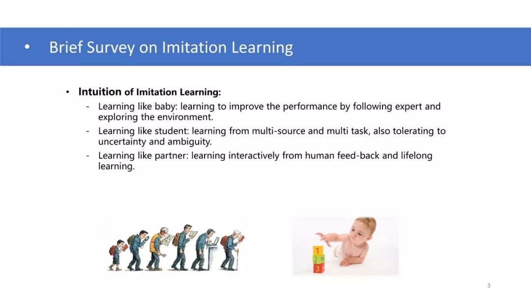 这次报告中,首先介绍模仿学习、迁移学习和拟人学习的一些基本概念和方法,然后介绍最近的基于倾向性的机器人迁移学习工作,最后进行总结与展望。