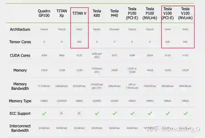 在上面讲述了为什么利用混合精度加速,需要用到 Volta 结构的GPU。在这里,我直接贴出 Nvidia 家各主流GPU的一些参数。以及拥有 TensorCore 的GPU列表:就目前而言,基本就只有V100 和 TITAN V 系列是支持 TensorCore 计算的。