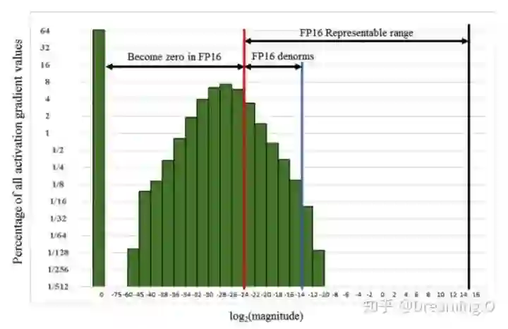 在第一节中,我们提到了 fp16 的有效的动态范围约为 ( ),比单精度的float要狭窄很多。对于深度学习而言,最大的问题在于 Underflow(下溢出),在训练后期,例如激活函数的梯度会非常小, 甚至在梯度乘以学习率后,值会更加小。