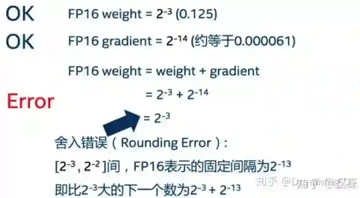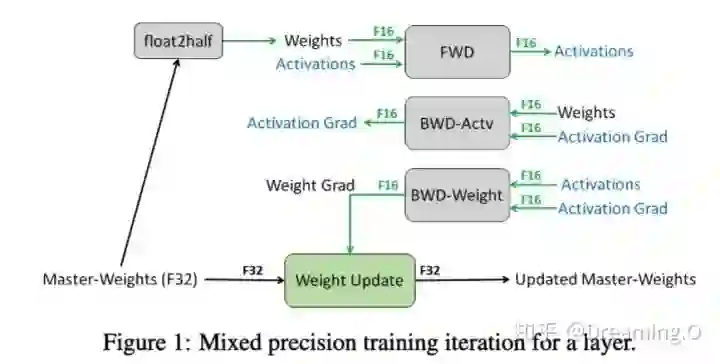 可以看到,其他所有值(weights,activations, gradients)均使用 fp16 来存储,而唯独权重weights需要用 fp32 的格式额外备份一次。这主要是因为,在更新权重的时候,往往公式: 权重 = 旧权重 + lr * 梯度,而在深度模型中,lr * 梯度 这个值往往是非常小的,如果利用 fp16 来进行相加的话, 则很可能会出现上面所说的『舍入误差』的这个问题,导致更新无效。因此上图中,通过将weights拷贝成 fp32 格式,并且确保整个更新(update)过程是在 fp32 格式下进行的。