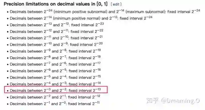这个例子非常直观的阐述了『舍入误差』这个说法。而至于上面提到的,FP16的最小间隔是一个比较玄乎的事,在wikipedia的引用上有这么一张图:描述了 fp16 各个区间的最小gap。