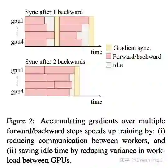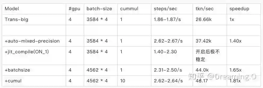 cumul 次的 back-propogation 操作后再更新一次模型,这样做的好处是减少多卡训练时,bp一次就update一次时的多卡等待时间。下面展示下具体的加速效果和一些备注: