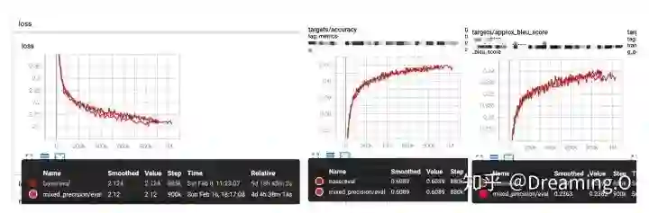 下面是实验(英语翻译到印地语机器翻译实验)对比,开启混合精度加速后,在校验集上的一些数据指标(loss,accuracy, approx_bleu_score)等均不受影响: