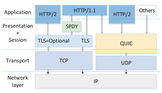 在传输层,TCP与UDP协议成为了互联网广泛采用的协议,各占据了网络流量的95%和5%。尽管研究人员开发了数据报拥塞控制协议(Datagram Congestion Control Protocol,DCCP)与流控制传输协议(Stream Control Transmission Protocol,SCTP)来作为TCP协议的改进版本,然而都没有得到广泛使用。与此同时,研究人员对TCP拥塞控制机制作出的改进提高了TCP在不断发展的网络中的传输性能,如具有更高带宽或无线通信的网络。