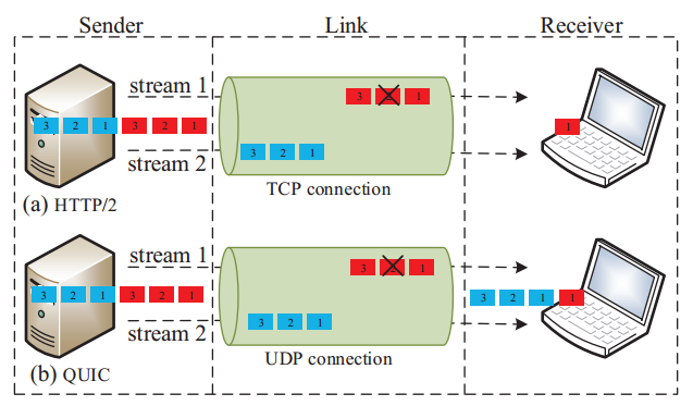 QUIC的多路复用机制是指通过单个传输连接发送多个数据流。在访问HTTP服务器时,由于HTTP/1.1一次只能请求一个资源,客户端通常需要建立多个并发的TCP连接,这种方式导致了复杂的连接管理以及低效的端到端资源的使用(每个连接都要从慢启动开始增加拥塞窗口)。HTTP/2则通过在一个TCP连接上进行多路复用来解决该问题。然而即使不同流(stream)的数据内容是相互独立的,如图5(a)所示,某条stream上的数据丢失仍然可能导致队头阻塞,因为TCP连接要求所有数据按照发送顺序传送到应用程序。在QUIC的设计中,如图5(b)所示,QUIC也支持在单个连接上复用并发的HTTP stream,一个QUIC连接可以携带相同或不同stream的多个帧,属于同一stream的所有帧按顺序传送。与HTTP/2不同的是其中一条stream中的丢包不影响其他stream的数据传输。