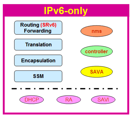 尤其值得注意的是,从IPv4到IPv6过渡是大势所趋。在过去的十年中,IPv4/IPv6翻译过渡技术和封装技术形成了IETF的标准,不仅使IPv4和IPv6能够互联互通,还使纯IPv6网络的部署成为可行。基于IPv6的分段路由(Segment Routing IPv6,简称SRv6),预计会在未来的十年大规模的部署,并派生出新的技术。由软件定义网络(SDN)实现SRv6的调度,实现细粒度的按需路由和政策性路由,实现自动化网络配置管理等。IPv6协议的IETF标准是没有NAT66的,因此可以做到源地址更加可信。源地址认证体系结构(SAVA、SAVI)在未来的十年也将实现大规模的部署。大道至简,纯IPv6网络将极大地简化网络的体系结构,如图7所示。其基本的技术模块包括:含SRv6的IPv6路由、IPv4/IPv6翻译、封装、特定源组播、网络系统、编排器、源地址认证,以及RA、DHCP、SAVI等。