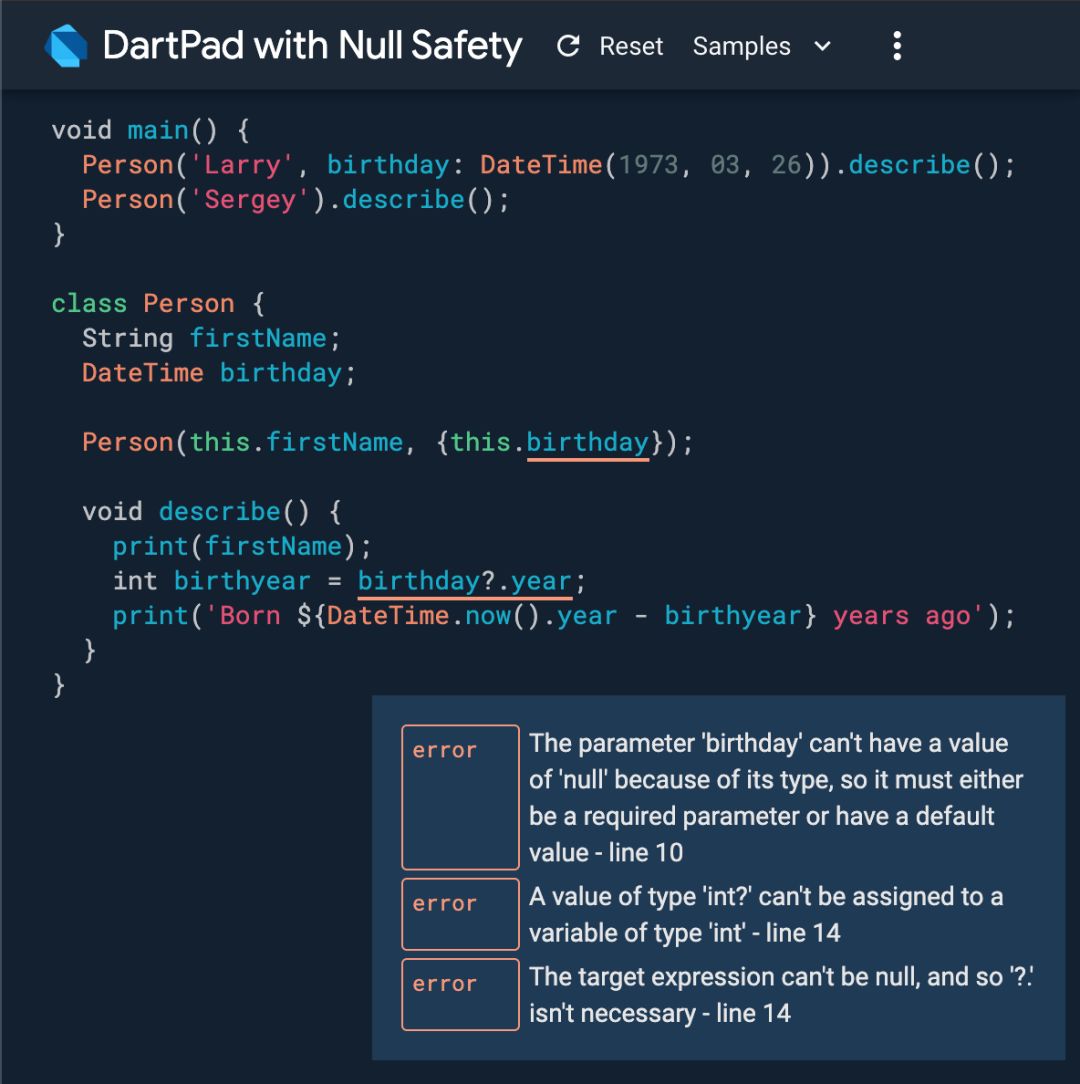 现在我们把这段代码粘贴进我们新推出的空安全代码体验环境,它是 DartPad 的一个特殊版本,其中包含静态分析功能 (是空安全功能的子集) 的技术预览。甚至都不需要运行代码,我们就可以看到 3 个问题: