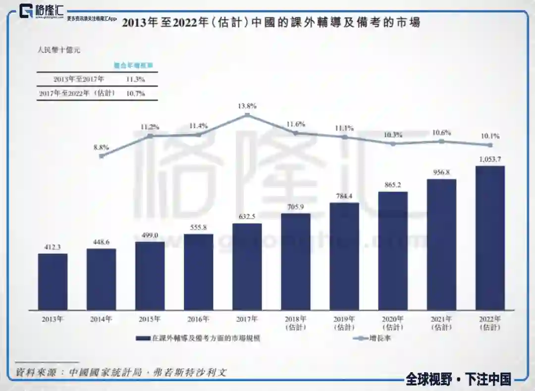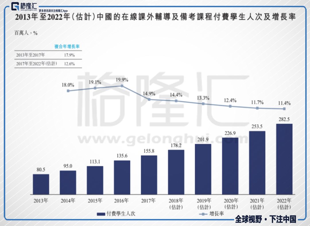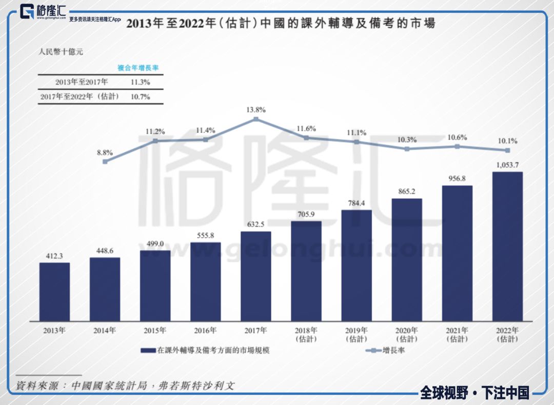 根据弗若斯特沙利文报告,中国在课外辅导及备考方面的总开支由2013年的人民币4123亿元增加至2017年的人民币6325亿元,复合年增长率为11.3%。预期到2022年,中国在课外辅导及备考方面的总开支将进一步增加至人民币10537亿元,自2017年起的复合年增长率将为10.7%。