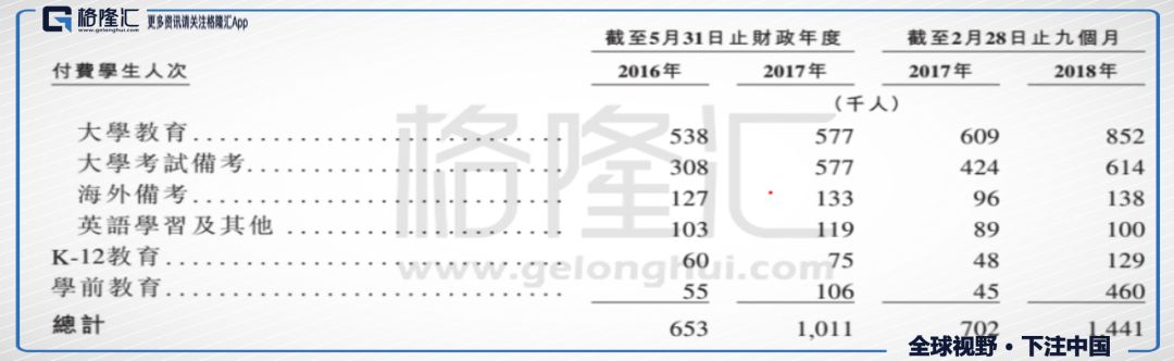 截至2018年2月28日止九个月,公司的学生报名流水约有80.3%及16.4%来自大学分部及K12分部。截至2016及2017年5月31日止财政年度及截至2018乃2月28日止九个月,公司课程付费学生人次分别为65.3万人、100万人、140万人,同期,亦有637、708、713名机构客户。