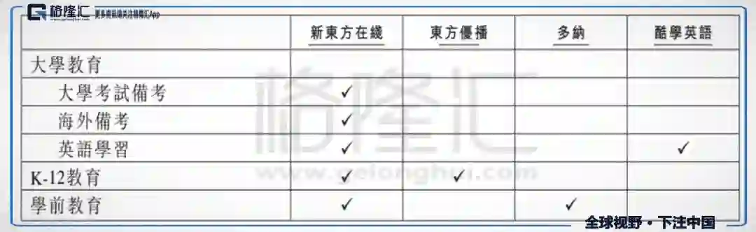 包括课外辅导课程,当中涵盖中国小学至高中的大部分标准学校学科,公司提供专为高等学校及高中招生统一考试而设的备考课程。公司于2015年推出K12课程。于2017年,开始向低线城市提供在线直播课程。截至2018年2月,该分部的付费学生人次为12.9万名,占总付费学生人次总数的9%。