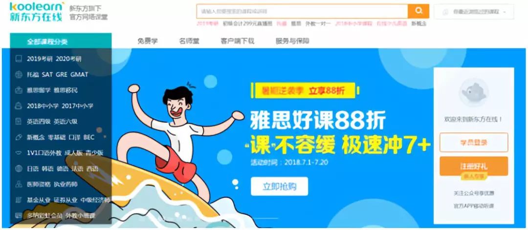 新东方在线成立于2005年,是新东方教育科技集团旗下的在线教育网站。主要为学前儿童、中小学生、大学生等提供涵盖出国考试、国内考试、职业教育、英语学习、多种语言、K12教育等6大类的课程。