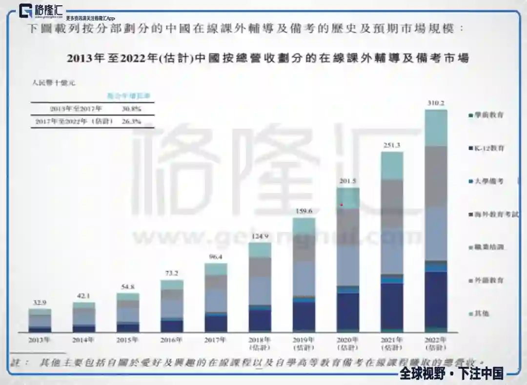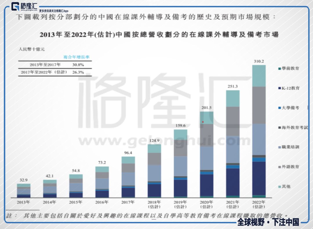 中国按总营收划分的在线课外辅导及备考市场规模由2013年的人民币329亿元增加至2017年的人民币964亿元,复合年增长率为30.8%,预期到2022年将进一步扩大至人民币3102亿元,自2017年的复合年增长率将为26.3%。有关增长率明显高于线上及线下市场增长率的总和。