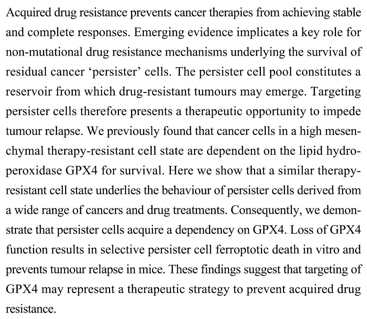 耐药性遗留癌细胞对 GPX4 抑制敏感