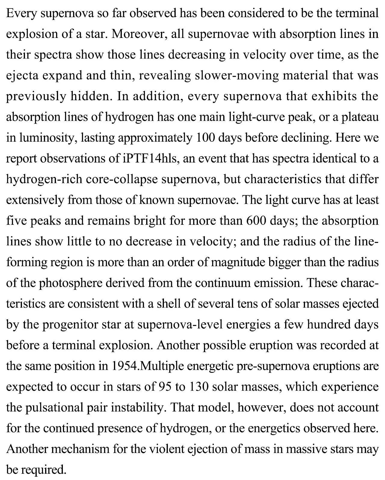 (导读 阿金)一般认为,超新星是恒星演化的最后阶段,爆炸产生的光亮会持续 100 天,随后变得黯淡。本研究观测到超新星 iPTF14hls 的特殊爆发事件,光谱显示这是颗富氢的核坍缩超新星。但不同寻常的是,它的持续发光时间超过 600 天,光变曲线至少有五个峰;吸收谱线显示喷射物并无降速迹象;总爆发能量是普通超新星的百倍。该发现对研究超新星的形成和爆发机制提出新的挑战。
