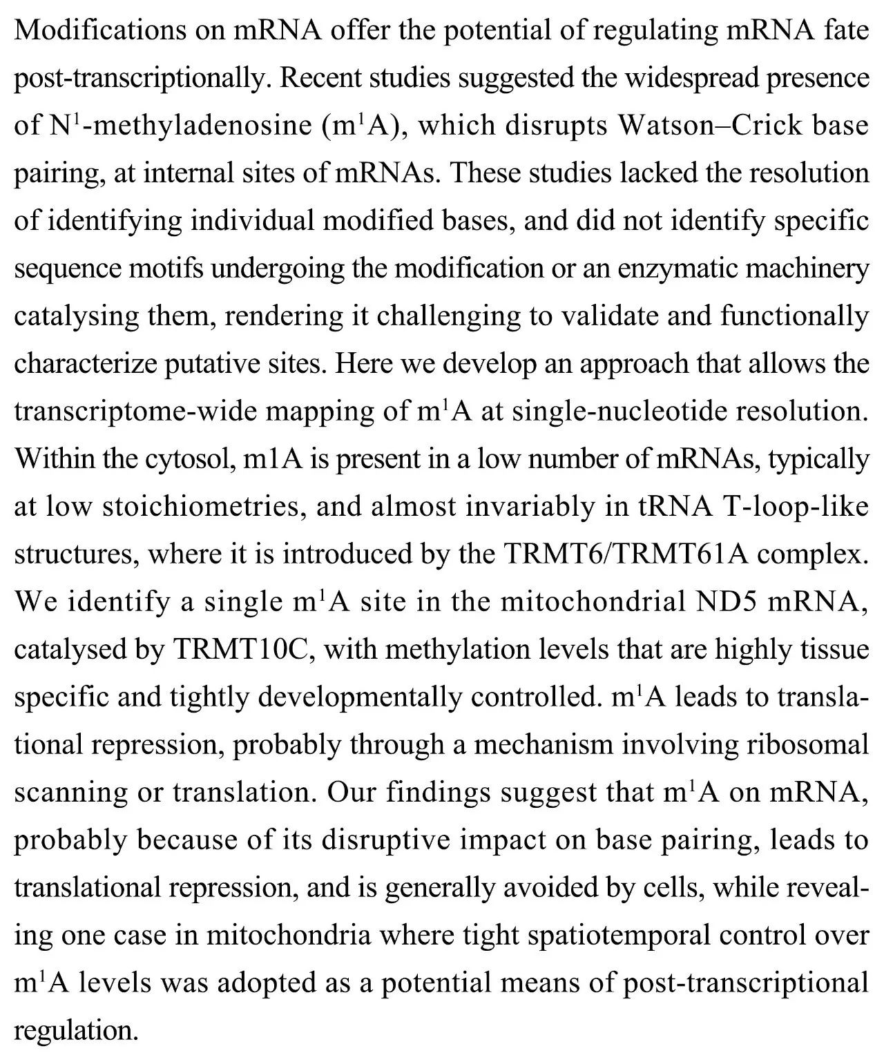 (导读 卓思琪)最近的研究表明,N1-甲基腺苷(m1A)修饰是一种广泛存在于 mRNA 内部的 mRNA 修饰。本研究揭示了转录组水平上,单核苷酸分辨率的 m1A 修饰分布情况。分析表明 m1A 修饰可抑制 mRNA 翻译,为避免此种抑制,胞浆 mRNA 中该修饰仅在特定位点少量存在。但研究也鉴定出了线粒体中具有组织特异性,可能具有转录后调节功能的特定 m1A 位点。