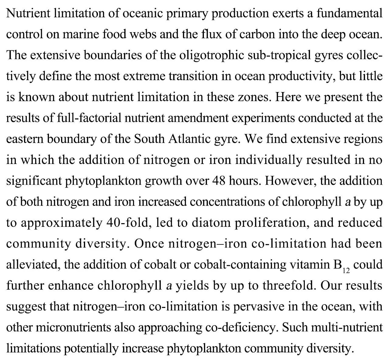 (导读 阿金)亚热带寡营养环流的边界确定海洋生产力的极端转变,而其营养限制机制未知。本研究在南大西洋环礁东部边界进行了全因子修正实验,发现氮和铁共同影响海洋中叶绿素 a 浓度,钴或维生素 B12 可进一步提高其产量,从而调控浮游植物生长并促进多样性。
