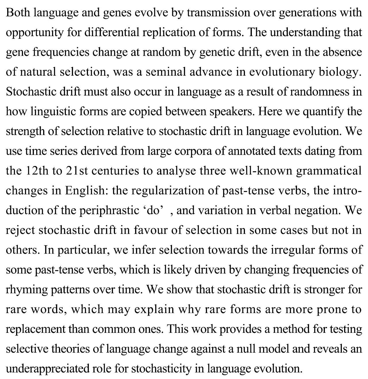 (导读 郭怿暄)与基因类似,语言在世代相传中可能产生不同复制,随机漂变对语言进化的影响尚不清楚。本研究量化分析了语言进化中随机漂变相关的选择力度,针对大量 12-21 世纪语言资料中三种重要的语法变化展开研究,发现漂变对罕见词汇具有更大影响,使其更容易被取代。这不但提供了语言变化的理论验证方法,还解释了随机在语言进化中的作用。