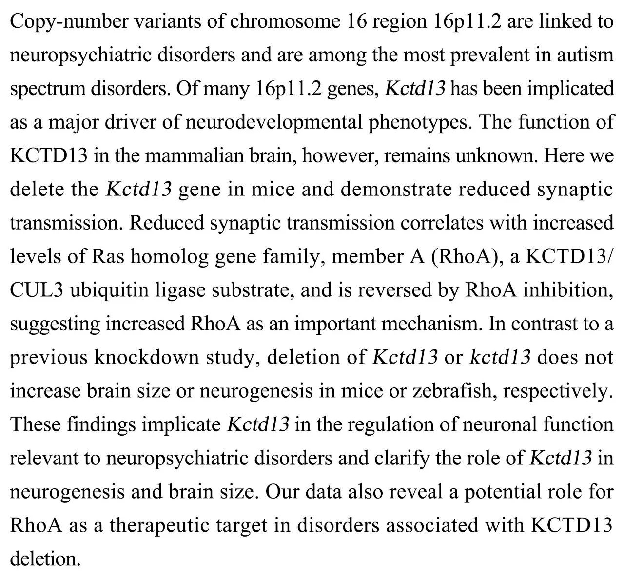 (导读 严冰)16 号染色体 16p11.2 区域的拷贝数变异常常与神经精神性病变相关,在自闭症中最为常见,其中 Kctd13 被认为是该区域驱动病变的主要基因。本文报导,在小鼠中删除 Kctd13 基因可减少突触传递,该过程与 KCTD13/CUL3 泛素连接酶底物、Ras 同源基因家族成员 RhoA 增加相关。这说明 Kctd13 很可能通过调控神经元功能诱发神经精神性病变,而 RhoA 可能是潜在治疗靶点。