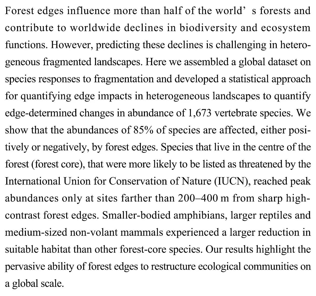 (导读 郭怿暄)本研究整合全球破碎化景观及其物种数据,开发全新统计方法,发现 1673 种脊椎动物中的 85% 以上丰度受到森林边缘影响,核心地带的物种在远离边缘 200 米以上时数量才达到顶峰,小型两栖类、大型爬行类和中型非飞行哺乳类动面临更多栖息地丧失,显示森林边缘对生态系统结构具有巨大影响。