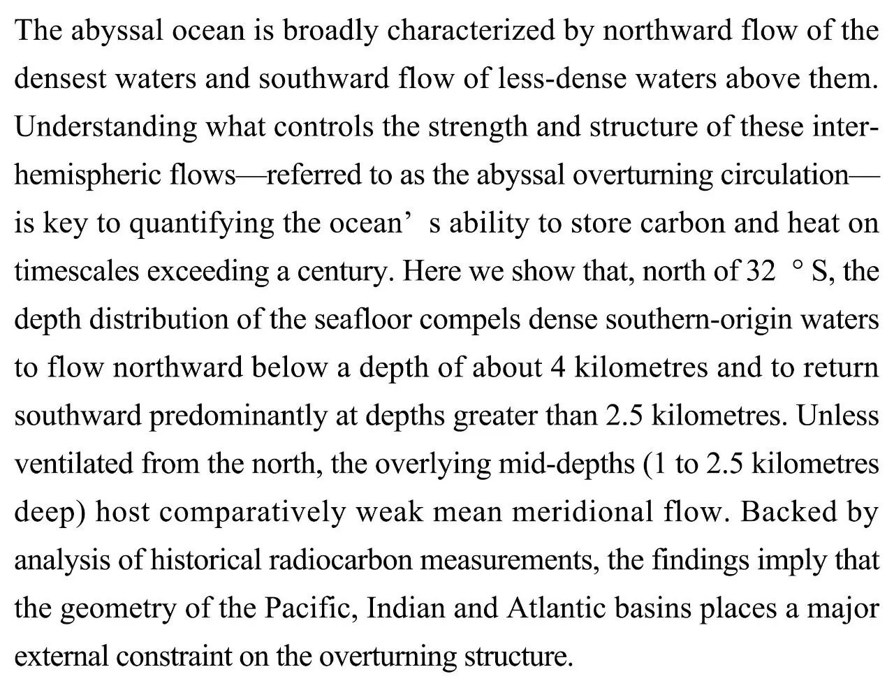 (导读 阿金)了解深海翻转环流调控机制是量化百年以上时间尺度的海洋碳热储存能力的关键。本研通过分析放射性碳历史数据,发现南纬 32 度以北的海底深度分布迫使源自南部的高密度水在约 4 千米深处向北流动,至深度超 2.5 千米处再往南回流,说明太平洋、印度洋和大西洋盆地的地形限制了翻转环流的结构。
