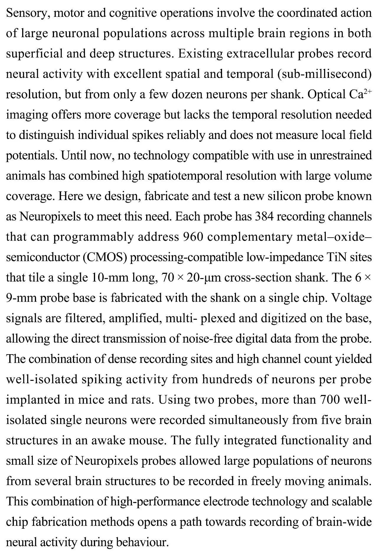 (导读 唐诗语)在自由活动的动物身上进行大面积、高时空精度的脑神经活动探测在此前尚未实现。本研究设计制造了集成于单一 6 × 9 mm芯片基板的硅探针 Neuropixels,它能够同时准确探测和处理几百个神经元的信号。使用两支探针,研究者对一只清醒小鼠 5 个不同脑区中超过 700 个独立神经元的活动进行了记录。