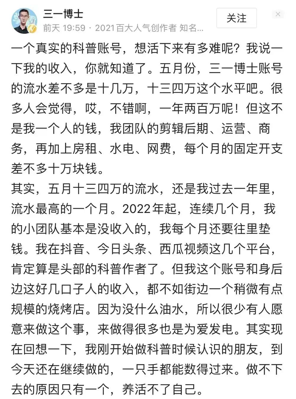 那么问题来了,为什么科普类型的博主粉丝多,赚钱却这么难呢?