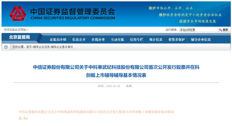 AI科技评论消息,北京证监会网站2月28日晚间披露,中信证券与中科寒武纪科技股份有限公司(简称“寒武纪”)在2019年12月5日签署辅导协议,后者计划在科创板上市。